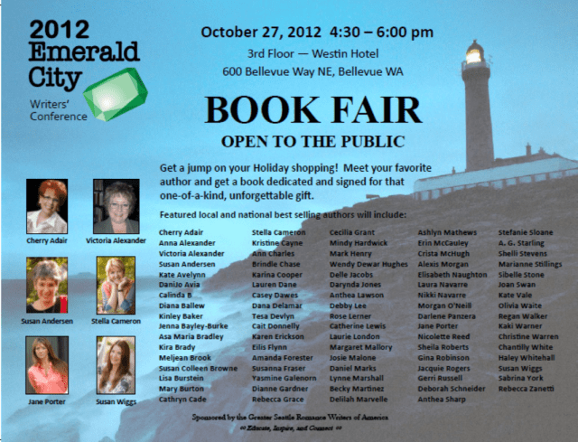 This is the question I dread the most. It shouldn’t be, but it is. In three weeks I will be a part of the Emerald City Writer’s Conference Book Fair which is open to the public. I will be sitting next to the likes of Cherry Adair, Susan Wiggs, Jane Porter, Yasmine Galenorn, to name a few. I mean I won’t actually be sitting next to them. Likely I will be shoved in a corner with a stool since I’m not really a staple of the romance industry…yet!